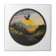 A sticker with an eagle flying over a mountain, in the style of contemporary landscape, golden light, black mountain college, fisheye lens, arts and crafts movement, mid-century illustration