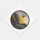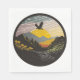 A sticker with an eagle flying over a mountain, in the style of contemporary landscape, golden light, black mountain college, fisheye lens, arts and crafts movement, mid-century illustration