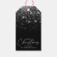 Elegant och moderna märkre för gåvor till helgdag som har vita flurries i snö mot svart bakgrund. "God jul" visas i ett trendig som innehåller ett vitt kalligrafiskt skript med namn i familjen som visas nedan i traditionell vit skrift.