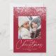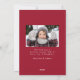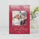 Unikt och modernt helgdag-kort med vita fallande snö-blommor överst på designen med fyllig kranbärsbakgrund i färgaden. Bilden på kvadraten visas mitten i designen med det Julhälsningar "God jul" i ett trendig med ett vitt kalligrafiskt skript som visas nedan. Anpassa framsidan av snöflingkortet genom att lägga till ditt namn och året. Kortet återgår till visning av ytterligare ett foto med ditt personliga meddelande i vitt, modernt brev.