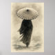 A solitary figure walks through a quiet snowfall, cloaked in a flowing robe and shielded by a traditional Japanese umbrella. This monochromatic ink-wash poster captures the essence of introspection and seasonal solitude, blending soft gradients with delicate brushwork. The serene composition evokes themes of impermanence, reflection, and quiet resilience—ideal for minimalist interiors, meditation spaces, and collectors of Japanese winter art.