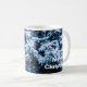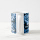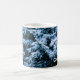 Snöfall i skogen. Snöflingor i luft. Snö täckte Julgran. Blå och grönt färg, vinterhumör. God jul och Gott nytt år till er och er! Fint kaffe mugg.