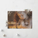 Elegant Christian Christmas card featuring a praying angel and falling snow with snowflakes on the front and a watercolor painting of poinsettia, conifer tree branches, holly and red berries at the back.