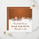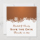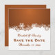 Snowflake-brunt vinterbröllop Spara datum meddelande, med en vit gräns av snöflingor på glödande chokladbrun gul gul gul bakgrund. Ett val av perfekt för Winter December bröllop.