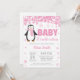 Inbjudan för Snowflake för baby shower för flicka för pingvinvinter rosa. Behandla som ett barn dess kall utanför baby showerinbjudan. Rosa Snowflake. Flickababy showerinbjudan. Inbjudan för vinterhelgdagbaby shower. Vitbakgrund. Behaga klickar "skräddarsy den" knäppas och använder vårt designverktyg för att ändra denna mall för mer ytterligare customization.