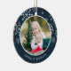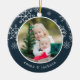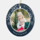 Festiv fotojulprydnad har ett favoritfoto på vardera sidan, inramat av vitt snöflingor på vibrerande juvel tonad marin blå. Anpassa med en anpassningsbar på vardera sidan som visas med namn och året.