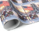 A family of snowmen stands proudly in front of a tall flagpole, with the American flag gently waving against a backdrop of snow-covered trees, as the sun casts a warm glow over the scene