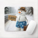A hitchhiking snowman, wearing a straw hat and a swim trunks, holds a 'Florida' sign by the snowy roadside, while a nearby suitcase adds a whimsical travel theme to the winter scene