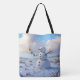 In a tranquil, snowy field, a snowman holds a daisy flower in one stick hand, while fluffy clouds drift across a brilliant blue sky, crafting a serene and picturesque scene that captures the essence of winter's beauty