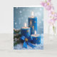 The holiday card shows three bright blue candles standing in the snowy scene. Each candle is a different height, with shiny gold stars on them. The candles glow warmly and shimmer on the snow. A pretty blue ribbon with a gold star on top ties them together nicely. Snowy pine branches stick out from the side. The background is blurry blue with snowflakes floating around. The candles look like they're covered in sugar or snow. This card feels peaceful and elegant, perfect for the holidays.🎅🏼🎄🎁 It's a lovely way to spread some holiday cheer!
