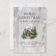 Vattenfärgat God jul-kort med en logghabin i skogen mot en rustisk träbakgrund i snöflingor. Anpassa enkelt det här helgdag-kortet med din familj namn och text.