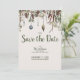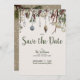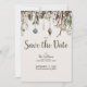 SNOWY TALLAR Jul-Julfest Spara datuminbjudan - Med ett grönland med naturliga vattenfärgsben från gräs, gräs, koner, grenar och blommigtar, droppande med kristaller och prydnadsföremål på benvit bakgrund, denna inbjudan innehåller "Spara datum" och annan text i ett modernt, handskrivet kalligrafi i gräs-grönten, med resten av inbjudan i en vacker svart sans serif-typografi. På baksidan av kortet finns en snöig vinterdroppning i gren träd med prydnadsföremål. Perfektens påminnelseinbjudan till ditt kommande evenemang, för att se till att dina gäster får gratis dagar.