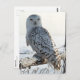 Animal card showing a snowy owl sitting on a fence. The snowy owl (Bubo scandiacus) is a large owl of the typical owl family Strigidae. This yellow-eyed, black-beaked white bird is easily recognizable. It is one of the largest species of owl and, in North America, is on average the heaviest owl species. The adult male is virtually pure white, but females and young birds have some dark scalloping; the young are heavily barred, and dark spotting may even predominate. Its thick plumage, heavily feathered taloned feet, and colouration render the snowy owl well-adapted for life north of the Arctic Circle.