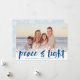 Moderna Hanukkah-fotokort innehåller din favoritbild med en vit snöflinga gräns längs grund. "Fred och ljus" visas i lapis blå penseltypografi, med namn och året under. Anpassa snöflaken som mönstras tillbaka med tre ytterligare foton och ett personligt meddelande.