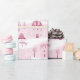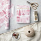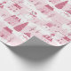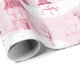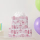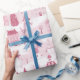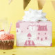 En söt rosa julby med en snövit bakgrund, prickad med leende snögubbar, skarp rosa träd och vackra hus.