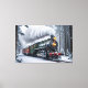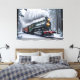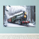 Ett Winter Wonderland-konstverk som fångar upp ett snövrak tåg som färdas genom ett pikturesque vintall.
