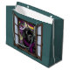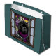 Bekvämt hand plockade och färgad Newfoundland puppy hund under vintern tittar genom ett snöfönster