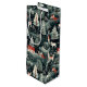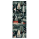 A lush, snowy winter scene with white deer roaming in snow covered fields dotted with red and white farmhouses and surrounded by hearty winter pine trees.