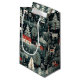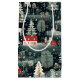 A lush, snowy winter scene with white deer roaming in snow covered fields dotted with red and white farmhouses and surrounded by hearty winter pine trees.