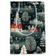 A lush, snowy winter scene with white deer roaming in snow covered fields dotted with red and white farmhouses and surrounded by hearty winter pine trees.