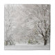 Utformningen innehåller ett foto av snö-täckt träd i skogsmark.