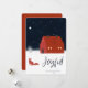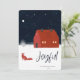 Glatt spelskript. Snowy vinterscen med himmel nattetid, konstellationer, rödräv och murrött stuga.