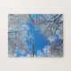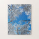 Tittar upp vid ett vackert blå himmel som är inramat av träd täckte grenar.