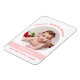 Trendig, klassisk personlig ny babys flickas flexibla fotomagnet att använda istället för ett födelsekort på papper till en fadder. Den innehåller en vit ram med en rund öppning för ett anpassat horisontellt foto, barnets födelseinformation och ett böjt rosa band där förnamnet och mellannamnet (eller förnamn och efternamn) på lilla en visas i ett elegant typsnitt. Denna design innehåller orden "Jag älskar dig, fadder Johanna!", som du naturligtvis kan anpassa.