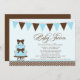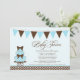 Denna 5x7 stilrena pojkes baby shower inbjudan har en mjuk blå och chokladbrun triangulär banner upphängd högst upp. Längst ner finns en vit och brun rand med prickar och en söt blå och vit tårta med bruna band på vänster sida. Till höger står Baby Shower skrivet med en elegant virvlande stil med din lätt anpassningsbara baby shower information nedan.