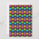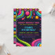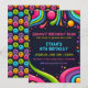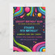 En livlig och lekfull födelsedagsinbjudan med en psykedelisk, retroinspirerad design. Den mörka bakgrunden är dekorerad med färgglada, virvlande former, abstrakta linjer och livfulla färgdropar som påminner om 1970-talet. Kanten är ett roligt mönster av flerfärgade glada ansikten, med stjärnor och bubblor utspridda i designen. Texten är i en blandning av feta och lekfulla teckensnitt, med viktiga detaljer markerade i ljust blått och rosa.