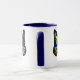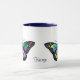 Här är ett ljust och färgstarkt mugg med en vacker, glödande fjärilbild på vardera sidan. Den konstnärliga bilden finns i många färg av blått, grönt, gult, rosa, orange, svart med mera! Mellan två bilder står anpassningsbarna i blått. Fantastiskt!