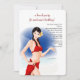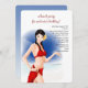 En strandskönhet klädd i en röd bikini med en blomma i hennes hår finns på en strandbakgrund med blå himmel. En underbar inbjudan till en flickas strand eller födelsedagsfest. Vill du ha spara pengar? Skriv ut med kvadraten kant papper.