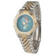 En vacker kvinnas huvud med ögon två stora lejona huvuden som framstår som mäktiga och stolta. Utformningen skapar en harmonisk koppling mellan kvinnans huvud och styrkan i lejona huvuden.
