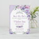 Anpassa denna snygga Quinceañera / Sweet 16 födelsedags kallelse "save the date" med dina detaljer enkelt och snabbt, tryck helt enkelt på knappen "anpassa" för att ytterligare ändra och formatera stil och placering av texten. Detta vackra kort har underbara akvarell-lila, syrenfärgade, lavendelblommor och silverfärgade accenter. All text är redigerbar! Perfekt för Quinceañera, Sweet 16, 18-årsdag, brud shower, trädgårdsfest, andra årets födelsedagsfirande, dop och mycket mer! Matchande produkter finns i butiken! (c) The Happy Cat Studio.