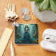 En vacker älv med en blommande tealklänning och ett halsband av akvamaringsten med daffodils och akvamariner i sitt långa färgad- och lätta tealdragonfly-liknande vingar som håller ett daffodilstativ i en magisk skog omgiven av blåsvamp, gult daffodils och mossy träd.