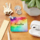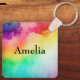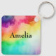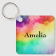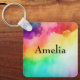 En nyckelkedja med en vattenfärgsbakgrund som innehåller färg av regnbågen.