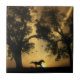 Detta är en vacker konstbricka med en galopperande häst i en soluppgång med ek träd och fåglar.