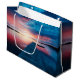 Gåsväska med ett strålande foto. En scenisk plats. En trevlig lugn sjö med trädocka utåt. Genom att ställa in sol får du ett vackert färg i himlar, ett levande rött och blått.