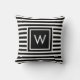 Elegant personlig svart-vit randig prydnadskudde med en elegant fet fyrkantig svart-vit initialmonogram. Du kan anpassa initialen och färgen till en färg du väljer.