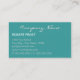 Monogram i enorm bokstavsstorlek som fyller visitkortet från topp till botten och överlagrar förnamnets initial över efternamnets initial med en liten skillnad i färg, namn och befattning i 90 graders vinkel på kortets högra kant - detta har en texturerad överlagring som kommer att texturera ditt monogram och bakgrundsfärg men lämna namnet och titeln ren - baksidan av kortet lämnar all text ren - ÄNDRA bakgrundens FÄRG genom att välja Anpassa, använd redigeringsrutan för bakgrundsfärg - den jag har valt här är en medel mörk teal - det texturerade utseendet kommer att finnas kvar. OBS: Detta kort är INTE verkligen texturerat, det är en konstnärligt utformad bild för att få det att se texturerat ut.