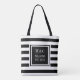 Snygg trendig personlig initialer monogram väska med svart-vit randig mönster med dina initialer och efternamn med ditt etableringsdatum i en svart kantad fyrkant med klassisk vit text. Designad av Thisisnotme©