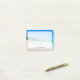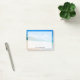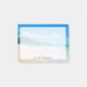 Fäst anteckningar med ett foto av en fantastisk semesterplats. Blått blå himmel, mjuk sandstrand med tropiskt kristallklart blått vatten. Ett lush träd täckte berget i bakgrunden. Scenfotografi och lugnande fotografi.