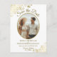 Detta vackra spara-datum-kort är designat för att ge dina vänner och familj förhandsbesked om ditt kommande bröllop. Det har en enkel men elegant design med guldtext på vit bakgrund, och ditt foto i en oval ram omgiven av krulliga gyllene falska folielockar och svängar. Baksidan har en söt grafik som lyder "boka oss" och utrymme för en anpassad anteckning.
