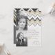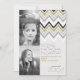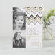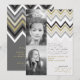 Denna moderna och snygga examensfest-inbjudan / examensfoto-kort design har ett stilrent och trendigt platt guld-, silver-, grå-, svart- och vit-chevron / sicksack-mönster med 3 fotokollage på framsidan och detaljer om examensfesten på baksidan av kortet.