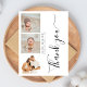 Snyggt Elegant 3Foto Nyfödd bebis Tack-vykort med ett modernt, minimalistiskt serif-teckensnitt och elegant-handskriven kalligrafi för "tack" på sidan, samt baby och familjefotografier. I kärlek och tack vare baby fototack har du ett anpassningsbar-meddelande på baksidan av redot som ska ändras. Underbar för en familj tittar för en enkel många-fotografidusch eller ett baby-meddelande tack för vykortet!