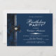 Ett modernt svart och blått födelsedagsfest inbjudan med en svart och blå presentbuske med en diamantförskönande utsmyckning på toppen av knatten. Stilt i vit text. Relevant information utbyts enkelt för att få information om din speciella händelse.