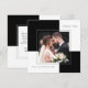 Ett vackert bröllop-tack i snyggt med ett modernt minimalistiskt format som omfattar blockerat färg i elegant svart över en vit bakgrund. Det unika fyrkantiga kortet har en koordinerande fyrkantig fotomall i mitten där du kan lägga till ett favoritfoto från bröllop eller annat önskat foto. Anpassa namn på framsidan med namn. På baksidan av kortet finns ett tackmeddelande som du kan anpassa med din egen formulering och namn. Det gör det så enkelt att snabbt få ut tackkortet samtidigt som du lägger till en speciell keepy av ditt foto med dina gäster i bröllop.