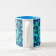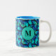 Snyggt mugg tryckte över hela hand plockade med en mönster av tropiska blå morfofjärilar. Framsida och baksida har en monogramcirkel för anpassade där du kan lägga till en egen inledning