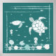 Snyggt tårblått poster av ett avslappnande sjölandskap under vatten. Havssköldpaddor, stjärnfiskar, sjöar, fiskar och sjöslätter på en vacker havsscen.