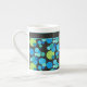 En mycket snyggt Bone China Coffee Mugg, med en Blue Måne abstrakt mönster i ljusblå blues och neon grönt på svart bakgrund, från en handmålad papper kollagedesign av Judy Adamson. Du kan lägga till text i det enkla bandet överst eller bara lämna det rent.